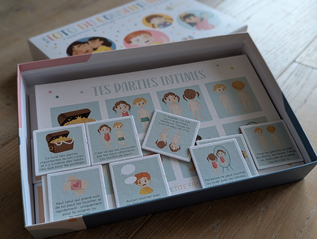 On parle ici d’un jeu à partir de 3 ans (même si 45 % des adultes devraient aussi y jouer, mais ceci est un autre débat). Le principe : un loto, avec des cartes qui représentent des situations quotidiennes. Certaines où on se sent bien (« J’aime quand papa me fait un câlin quand je suis triste »), d’autres où ça coince un peu (« Je n’aime pas quand quelqu’un me fait un bisou sans me demander »).